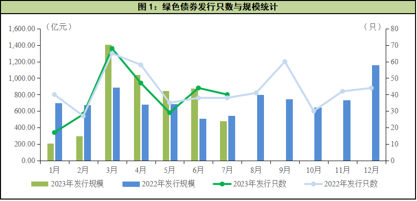 新华财经北京8月22日电 2023年7月,偿还压力减轻导致信用债发行整体缩量,受此影响国内市场绿色债券发行量与发行规模有所回落。2023年7月国内市场共发行40只绿色债券,规模共计478.68亿元,发行只数与规模较6月环比分别下降9.09%和45.44%;较去年同期发行只数同比增长5.26%,发行规模同比下降12.02%。其中2023年7月碳中和债券共发行12只,规模共计178.11亿元;蓝色债券发行1只,规模为1.00亿元;绿色和可持续发展挂钩双贴标债券发行1只,规模为20.00亿元。