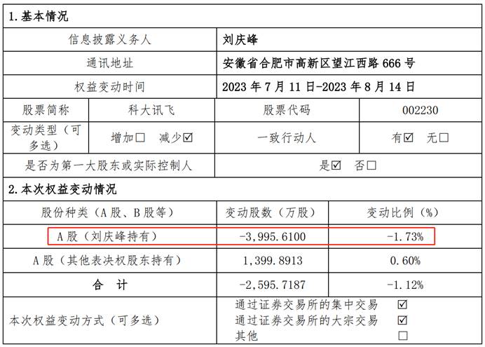 减持公告显示,2023年8月14日,刘庆峰通过深交所大宗交易系统卖出公司部分股份,减持3995.61万股,刘庆峰持股比例从7.27%降为5.54%。