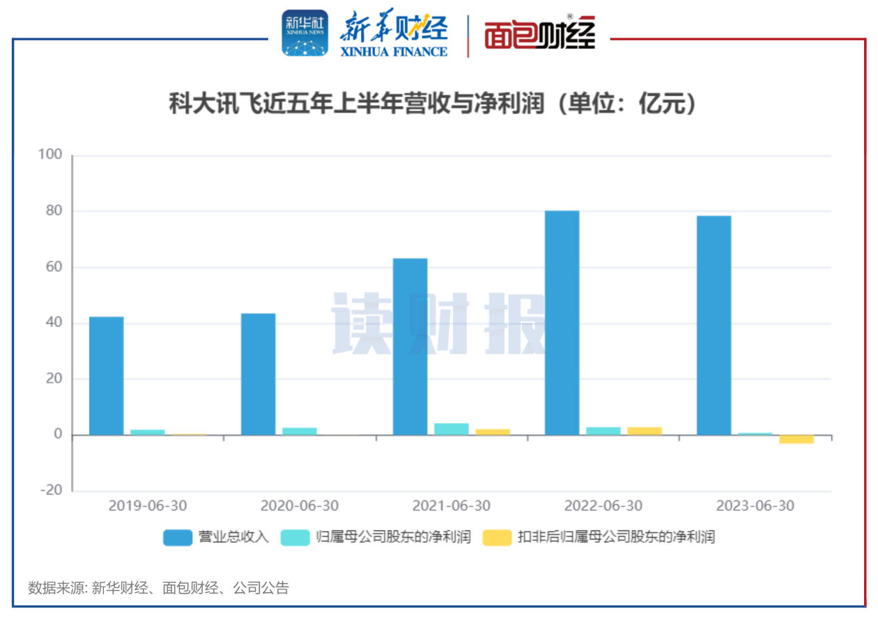 然而,科大讯飞近期披露的中报显示,2023年上半年,公司实现营业收入78.42亿元,同比减少2.26%;归母净利润7357.2万元,同比减少73.54%;扣非归母净利润-3.04亿元,同比下降208.99%,自2008年上市以来上半年扣非净利润首次录得亏损。