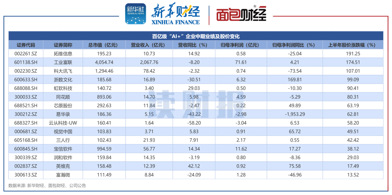 已披露半年报的“AI+”企业中,工业富联、科大讯飞、同花顺等15家企业市值超百亿元,其中营收同比下滑的企业有8家、归母净利润同比下滑的企业有7家,整体表现一般。