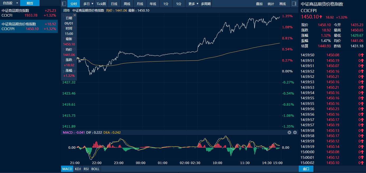 国内商品期货市场9月1日大面积上涨。追踪国内商品市场的中证商品期货价格指数收报1450.10点,较前一交易日上涨1.32%;中证商品期货指数收报1933.78点,较前一交易日上涨1.32%。