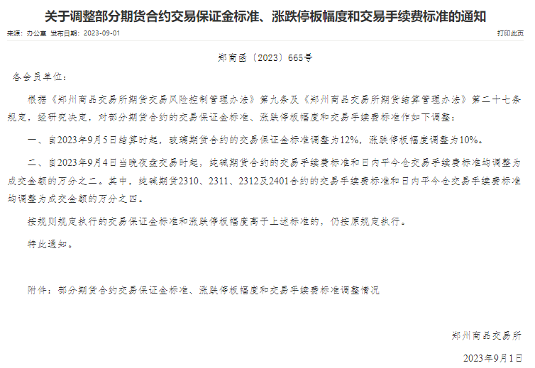 郑商所发布通知,自9月5日结算时起,玻璃期货合约的交易保证金标准调整为12%,涨跌停板幅度调整为10%;自9月4日当晚夜盘交易时起,纯碱期货合约的交易手续费标准和日内平今仓交易手续费标准均调整为成交金额的万分之二。