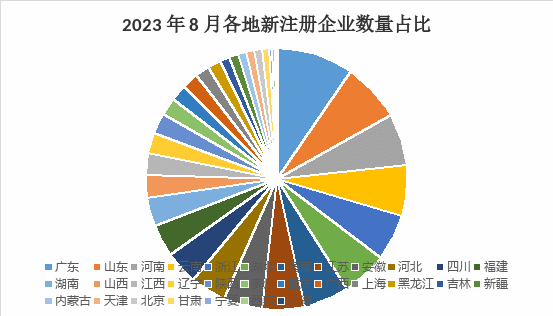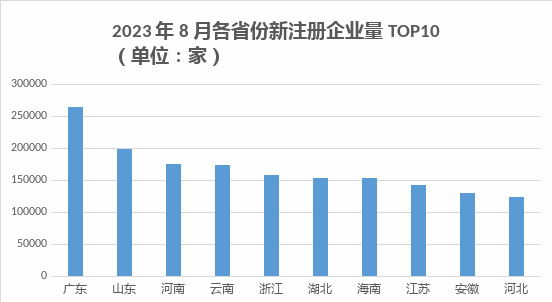 从8月份各地新注册企业量来看,广东省新注册企业26.5万家,仍然是注册企业量最多的省份,并且远高于第二名山东省(19.81万家),再次说明广东省对新注册企业的友好度较高,营商环境较好。