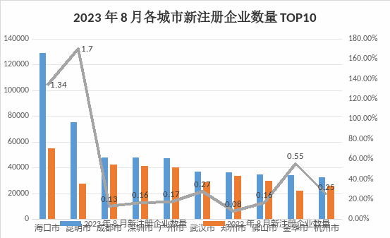 具体看各城市的新注册企业数量,海口市和昆明市的注册量和增长量都显著增长,数据格外醒目。在城市排名TOP10中,省会城市有7个,广东省的城市有3个。