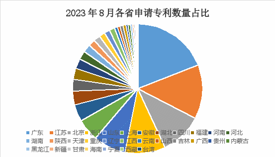 2023年8月,我国专利申请数43.89万件,较上月小幅增加,增长3.88%,但是较上年同期还是明显下降,下降28个百分点。从数据来看,各省在专利申请量方面同比均为负增长。