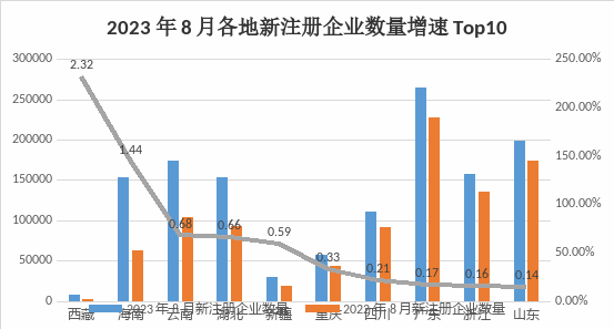 从各地新注册企业数量增速来看,西藏和海南增速遥遥领先,8月份新注册企业量同比分别增长231.73%和143.61%。云南省延续了上月较高的增速,在8月份各省增速排名中位列第三,同比增长67.79%。