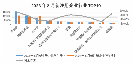 从新注册企业所属行业来看,8月新注册企业量最多的10个行业分别为:零售业、商务服务业、批发业、科技推广和应用服务业、软件和信息技术服务业、农业、房屋建筑业、专业技术服务业、建筑装饰装修和其他建筑业,以及餐饮业。