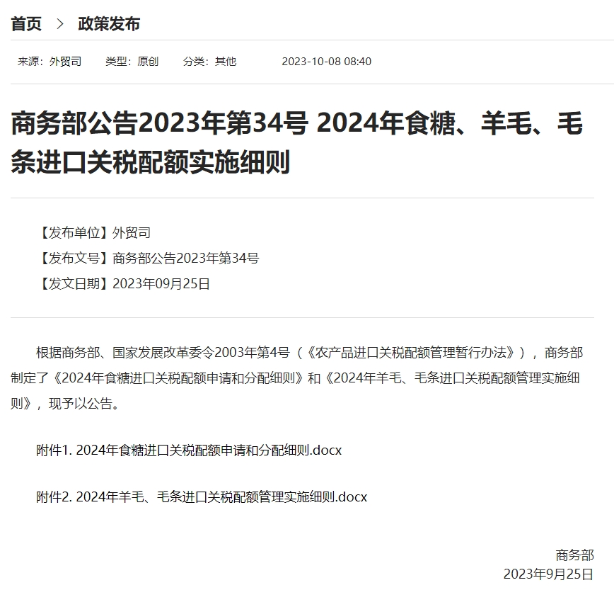 商务部制定了《2024年食糖进口关税配额申请和分配细则》和《2024年羊毛、毛条进口关税配额管理实施细则》。其中提到,2024年食糖进口关税配额总量为194.5万吨,其中70%为国营贸易关税配额。