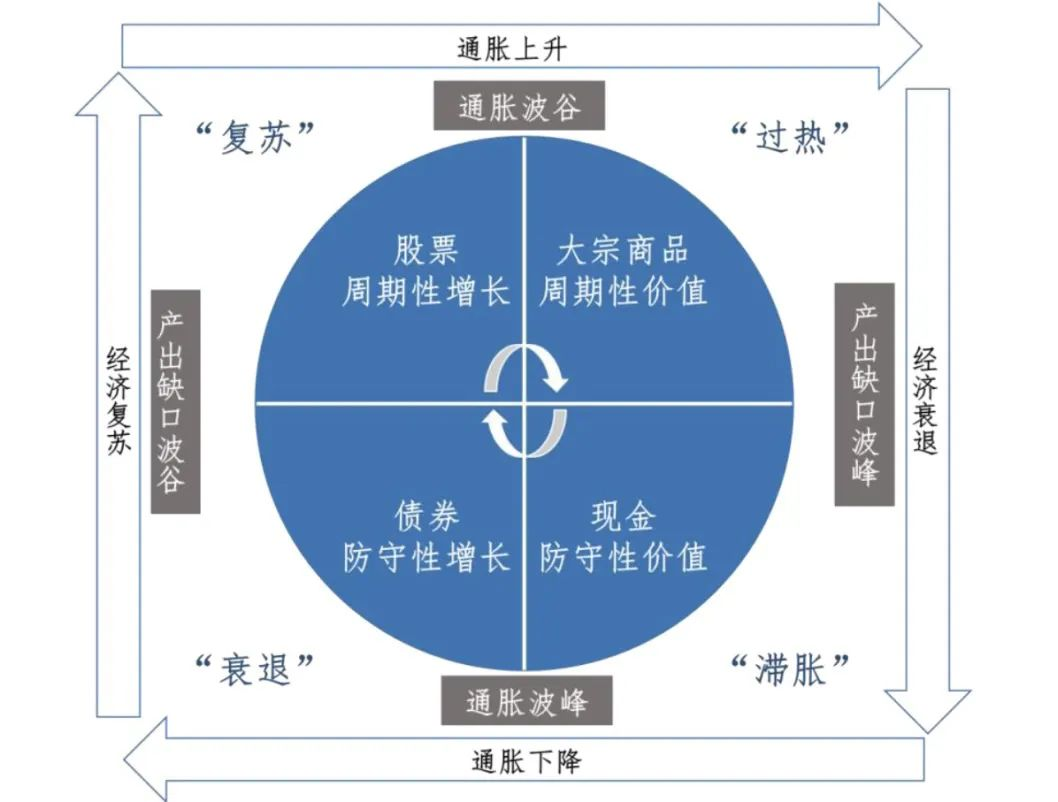从资产配置的角度,什么时候适合配置货币基金呢?根据美林时钟的理论,是在“经济下行、通胀上行”,也就是滞胀的阶段(下图)。在滞胀阶段,现金收益率提高,持有现金最明智。同时经济下行对企业盈利的冲击将对股票构成负面影响,不断上升的利率也会让长期债券价格受到冲击,此时投资者对于资本市场配置的信心也很不足。因此持有现金在滞胀环境下是最明智的选择。