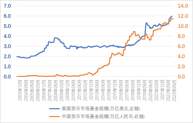近期关注到一组很有意思的数据:中国市场的货币基金规模创新高达到了11.5万亿人民币。另一边,美国市场的货币基金规模也达到了5.98万亿美元,双双创了新高(见下图)。