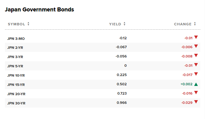 受到避险情绪提升等因素带动,日债收益率周二(5月24日)普遍下行,10年期日债收益率回落至月初水平,尾盘报0.225%,日内走低1.7个基点。