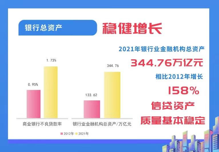 中国银行业总资产在金融业总资产中占比超过90%,银行稳则金融稳。2021年年底,中国银行业金融机构本外币资产344.76万亿元,商业银行不良贷款率1.73%,商业银行信贷资产质量基本稳定。
