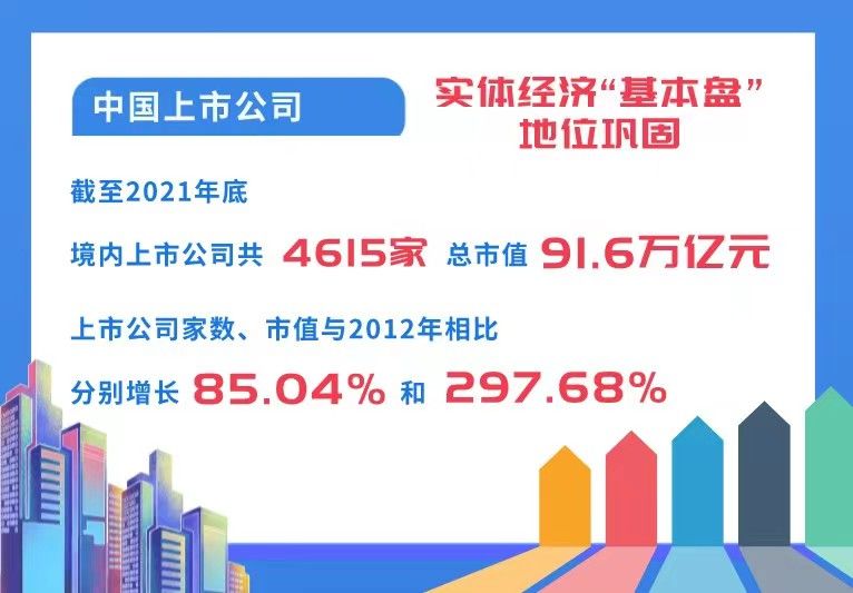 2012年以来,中国上市公司规模快速增长,实体经济“基本盘”地位更加巩固。截至2021年底,境内上市公司共4615家,总市值91.6万亿元;上市公司家数、市值与2012年相比分别增长85.04%和297.68%。上市公司总市值占GDP的比重由2012年年末的42.77%,提升至2021年年末的80.1%。