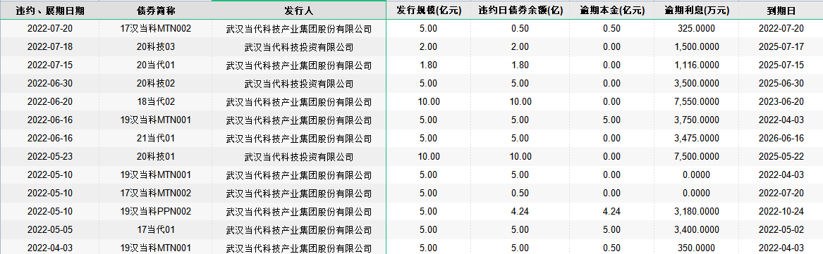 根据新华财经统计,目前武汉当代科技产业集团有13只债券实质违约或展期,涉及债券余额超60亿元。就在上一交易日,武汉当代科技产业集团公告称,因受新冠疫情不利影响,叠加宏观经济环境、行业环境等变化,武汉当代科技产业集团未能于兑付日2022年7月20日足额兑付17汉当科MTN002到期本息。根据《银行间债券市场非金融企业债务融资工具持有人会议规程》,经与发行人沟通,拟就17汉当科MTN002展期事项召开持有人会议。