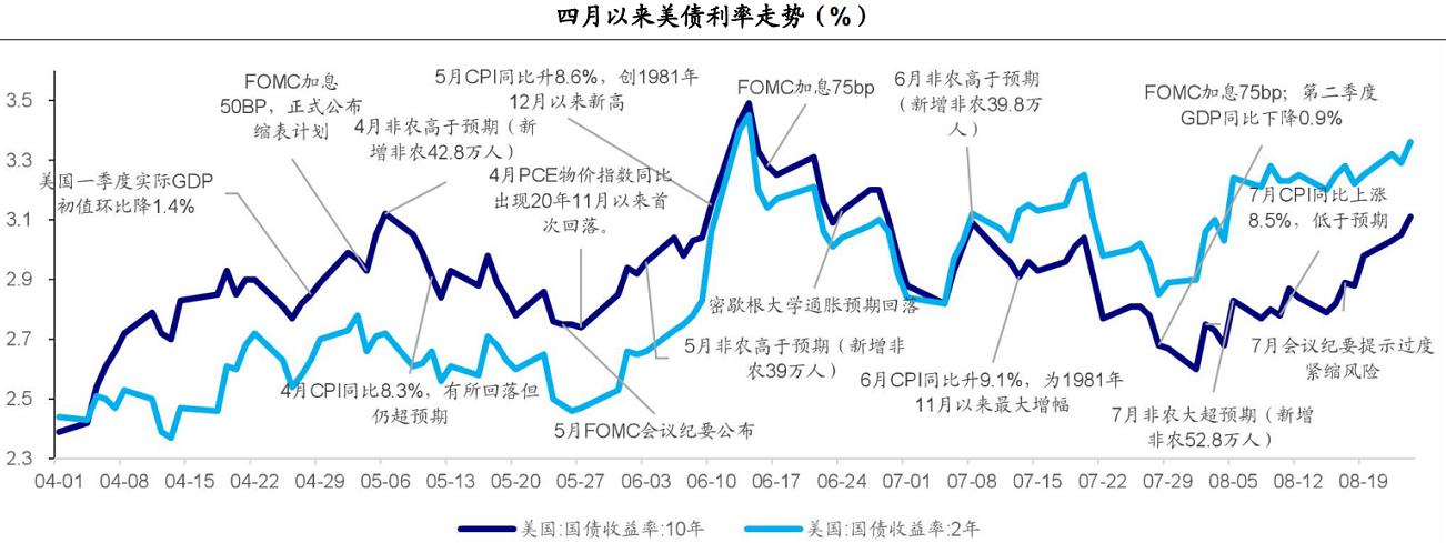 李迅雷最新表示,由于通胀挥之不去,美联储加息和缩表的节奏很难放缓,9月份加息至少会达到50个基点。最近这段时间以来,10年期美债收益率再度上行,也表明了市场对加息预期的担忧。
