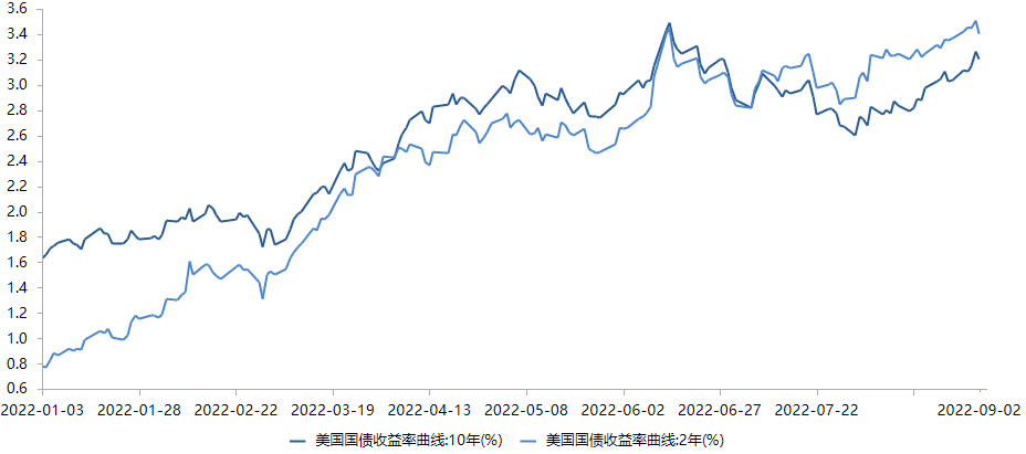 今年美联储已连续4次加息,当前联邦基金利率目标区间在2.25%至2.5%之间,是2008年次贷危机以来的最高点。高通胀叠加美联储加息预期,2年期美国国债收益率由年初0.78%最高上行到3.45%,10年期美国国债收益率由年初1.63%最高上行到3.265%。7月初至今,美国2年期、10年期国债收益率持续倒挂引发市场对明年美国经济衰退的预期。