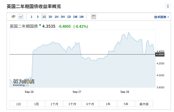 市场对这一声明反应剧烈。英国10年期国债收益率暴跌36.6BP,30年期国债收益率重挫64.2BP,势创纪录跌幅。2年期英债收益率短线快速下挫,随后略有反复,现维持在4.35%附近。
