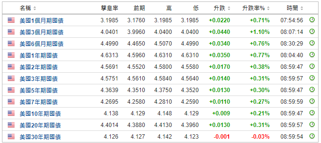 除1个月期限品种外,美债收益率全线超越4%。