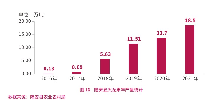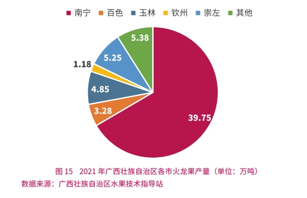 2021年,广西南宁的火龙果种植面积达18.8万亩,产量达39.8万吨,仅隆安县火龙果的种植面积就达到7万亩,产量达18.5万吨,占全市火龙果产量近一半。