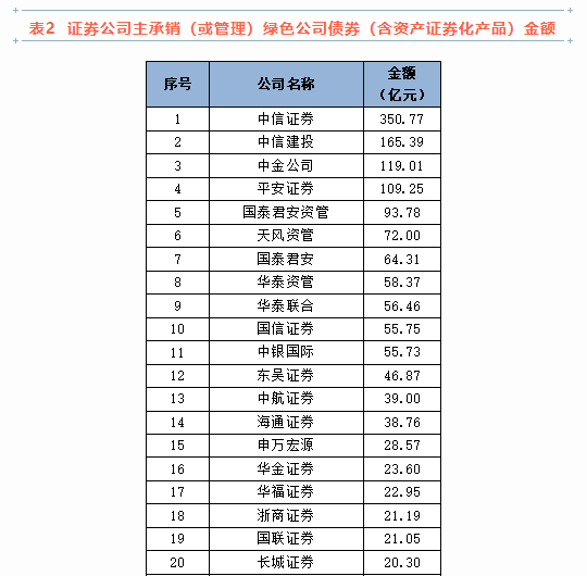 中信证券、中信建投、中金公司、平安证券、国泰君安资管在绿色公司债券(含资产证券化产品)主承销(或管理)家数和金额两项排名中均位居前五,其中,中信证券主承销金额达到350.77亿元,占比超过20%。