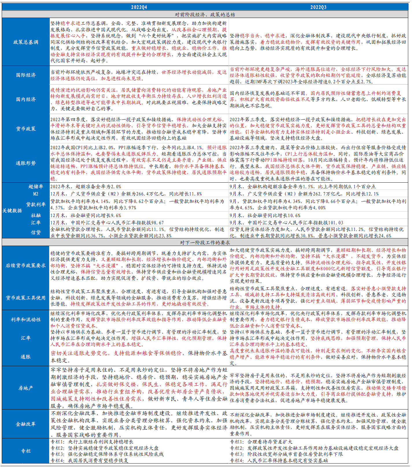 与2022年第三季度央行货币政策执行报告相比,第四季度的报告进行了边际调整,主要体现在经济和通胀预期的再管理。整体来看,央行当前对下一阶段货币政策的定调更多意在引导金融机构用好存量工具来支持实体经济。