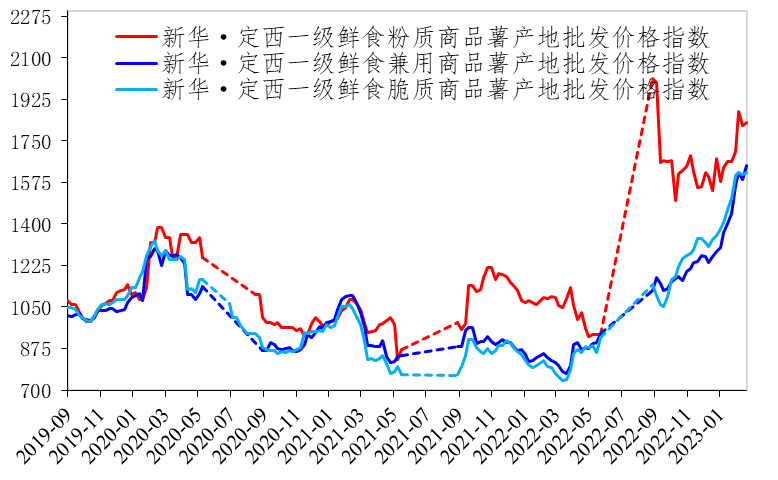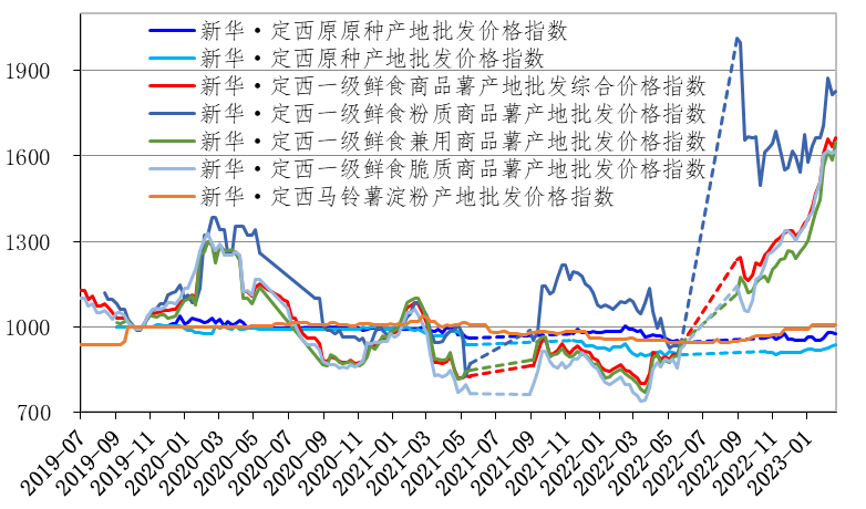 截至2023年2月24日,新华·定西一级鲜食商品薯产地批发综合价格指数为1665.54点,月度环比(1月28日,下同)上涨10.50%,同比(2022年2月25日,下同)上涨97.59%;新华·定西原原种产地批发价格指数为976.87点,月度环比上涨2.39%,同比下跌1.62%;新华·定西原种产地批发价格指数为936.20点,月度环比上涨1.97%,同比亦上涨1.91%;新华•定西马铃薯淀粉产地批发价格指数报1007.39点,月度环比持平,同比上涨4.95%。此外,定西马铃薯全粉出厂价格仅是略微上浮。