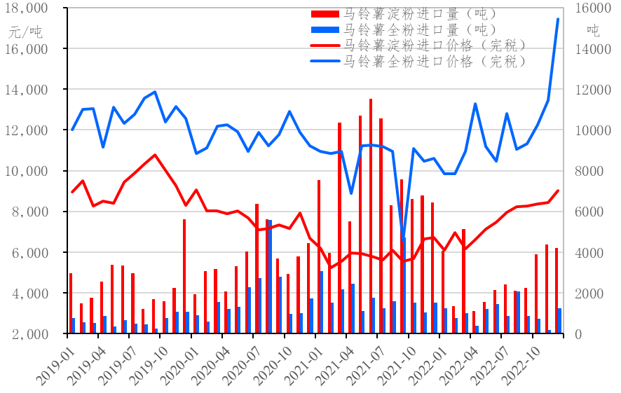 图8.我国薯制品进口月度量价全量图