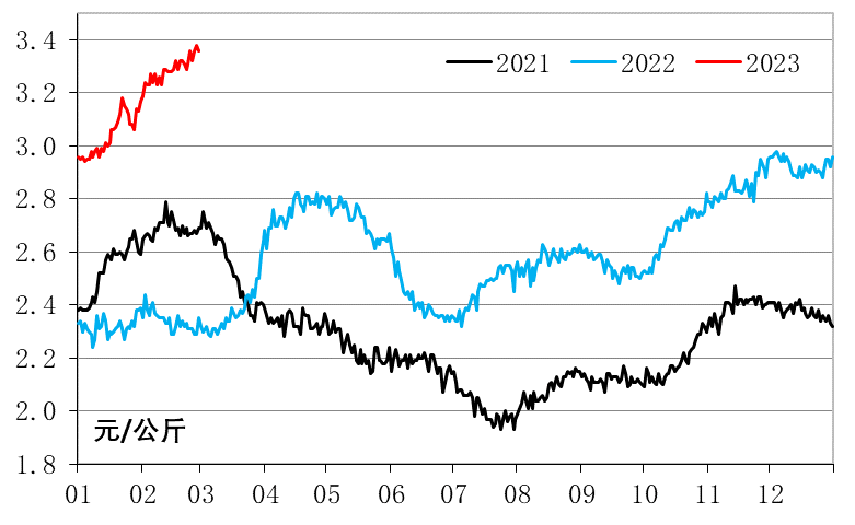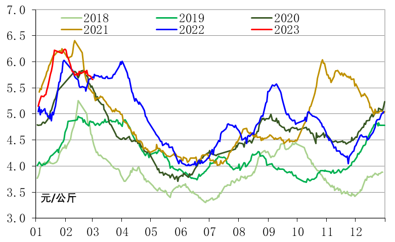 春节后消费需求放缓,国内蔬菜批发价格持续下跌,仅2月中旬国内普遍雨雪天气减缓了价格下跌的速度。截至2月28日,全国蔬菜批发均价为5.67元/公斤,同比(2022年3月1日,下同)下跌0.70%,开始转跌;月度内累计下跌8.84%。接续国内蔬菜供给充足以及生产成本上涨,与上一年一线城市疫情影响下相比价格或将持续偏弱,较其他年份同期保持上涨态势。