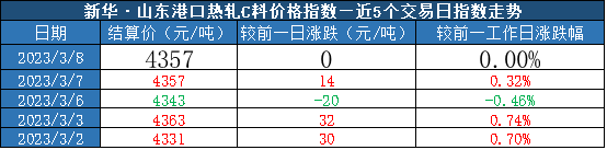截至2023年3月8日,新华·山东港口热轧C料价格指数报4357元/吨,较前一交易日持平。
