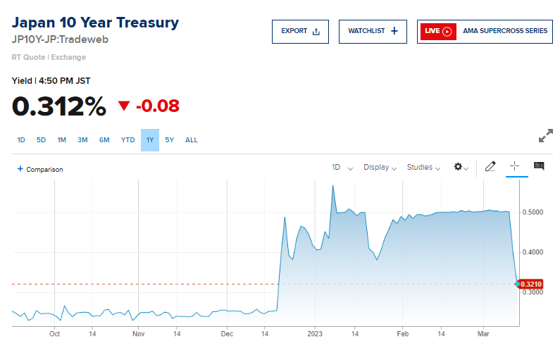 另一方面,机构多数预计,在该事件影响之下,美联储的激进加息进程或将按下“暂停键”,这一预期推动亚市交易时段的美债大幅回暖,对加息最敏感的2年期美债收益率一度跳水30BPs左右,亚洲避险资产也同步走强,日本10年期国债收益率自2022年12月以来首次跌破0.3%。