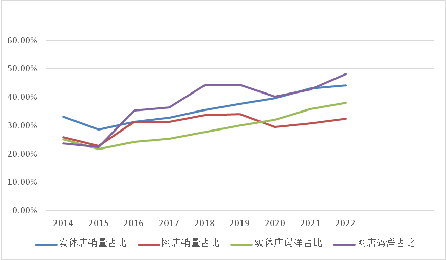 渠道上,2014—2022年的数据显示,原创绘本在实体书店和网店的销量和码洋占比,整体上呈现曲折上升的态势。