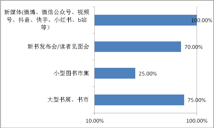 据调查结果,助推原创绘本销售的重要阅读推广途径依次是学校推荐、知名阅读推广人推荐、绘本馆推荐、图书馆和公益组织推荐。从出版机构的回复情况看,100%受访机构选择了将新媒体作为触达读者的主要方式,新媒体成为出版机构直接面向读者营销的主阵地。75%的出版机构同时选择了大型书展、书市作为触达读者的主要方式,而近年逐渐兴起的小型图书市集由于受地域等因素限制,目前还只是小众之选。