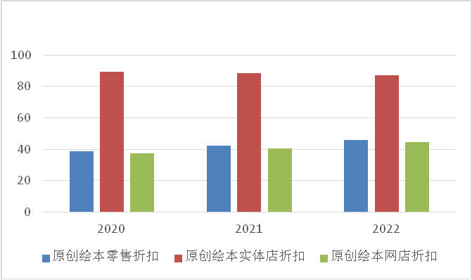 对比下,实体书店的原创绘本折扣力度较小,2020年至2022年的折扣分别是89.42%、88.45%及87.33%,平均折扣为88.4%。这背后折射的是整个实体书店行业批零倒挂现象的严峻和实体书店高成本运作的情况。