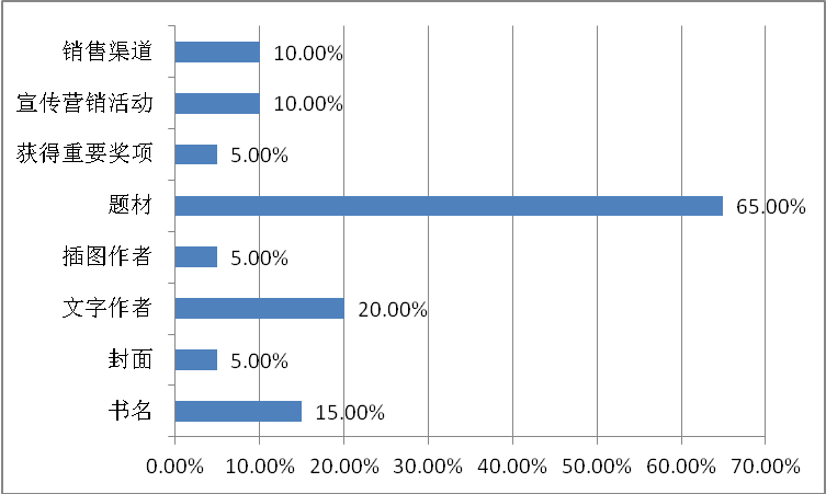 据调查结果,受访机构心目中的“原创绘本重要市场销售渠道排名”依次是三大平台(当当、京东、天猫)、抖音、实体书店、小红书、视频号、快手和B站。此外,社群和绘本馆仍然是不少出版机构的重要市场销售渠道,社群甚至被有的出版机构视为首选渠道。在“原创绘本取得市场成功的重要因素排名”调查中,65%的出版机构认为题材是原创绘本取得市场成功的首要因素。其他因素按重要性排名依次是文字作者(20%),书名(15%),销售渠道(10%)和宣传营销活动(10%),封面(5%)、插图作者(5%)和获得重要奖项(5%)。