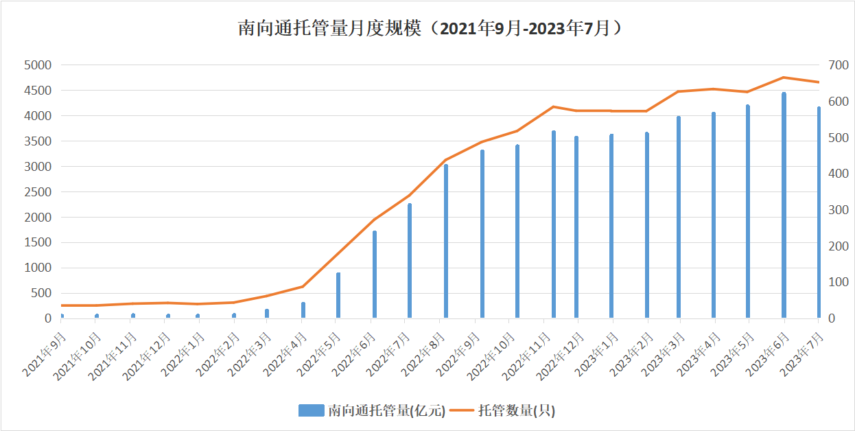 根据设立之初《关于开展内地与香港债券市场互联互通南向合作的通知》,“南向通”年度总额度为5000亿元等值人民币。截至2023年7月末,上海清算所“南向通”托管量652只、共计4149.4亿元,是开通首月托管量55.25亿元的75倍;而在今年6月末,“南向通”债券托管规模更是创下业务开通以来的最高值,一度达到4438亿元,距离全年限额5000亿元仅剩余562亿元,额度使用占比最高触及88.76%。