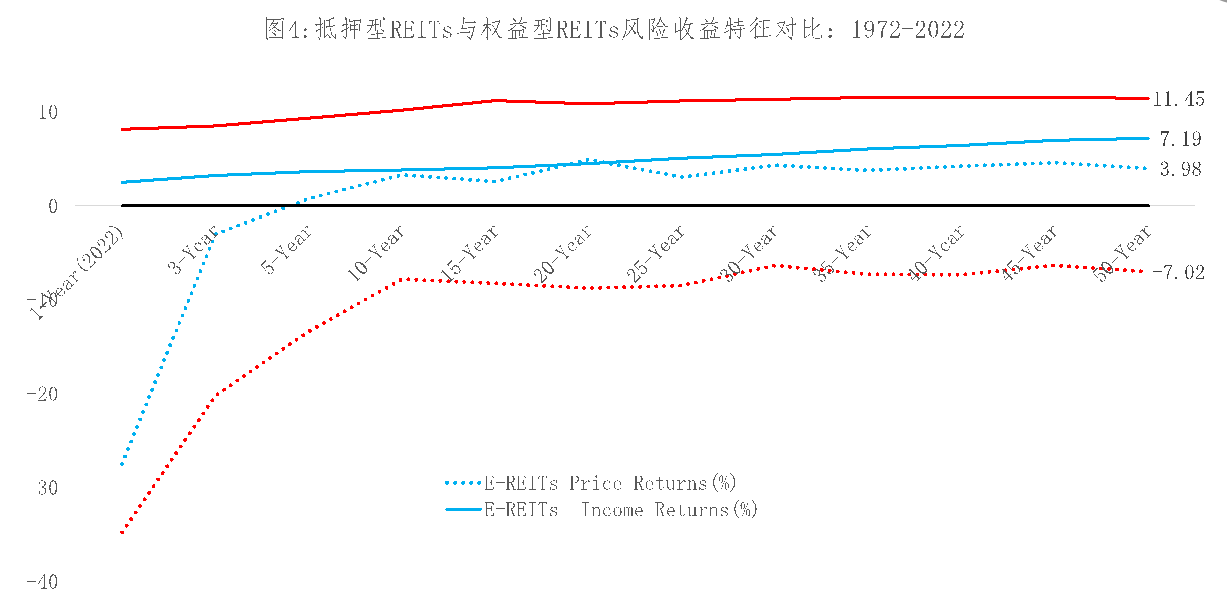 (3)5年-50年不同期间权益型REITs平均回报区间为4.5%-11%,抵押型REITs平均回报区间为-4%-5.5%。