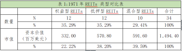 1971年代:1971年美国上市REITs为34只,其中:权益性12单,抵押型12单,混合型10单。总市值约1.5亿美元,其中:权益型3.32亿,抵押型5.71亿,混合型5.92亿。从上市数量占比来看,三种类型几乎“三分天下”。从市值来看,权益型REITs只是REITs市场20%份额的配角。