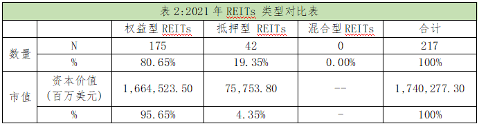 至2021年末,无论REITs公开上市数量和资本市值规模,权益型REITs独霸江湖。如下表2: