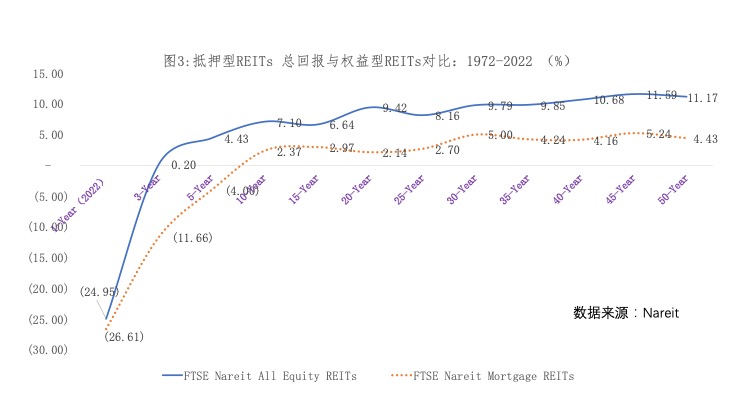 (2)短期对比:3年期平均总回报,权益型REITs平均总回报-0.20%,抵押型REITs平均总回报-11.66%,相差11.2%