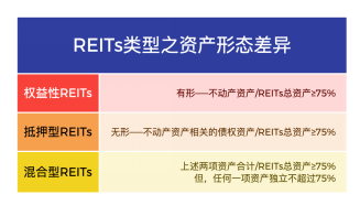 混合型REITs:两种资产形态形成的资产投资组合。其风险收益特征介于两者之间,但更多的体现为抵押型REITs的风险特征。混合型REITs的更大风险和挑战在于管理人需要具备不动产管理和金融资产管理两种能力。