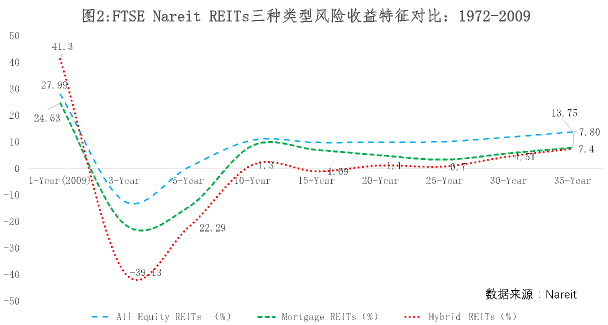 (2)3年、5年、10年15年、20年、25年、30年及35年的各时间区间的平均总回报中,权益型REITs优于抵押型REITs,抵押型REITs优于混合型REITs。
