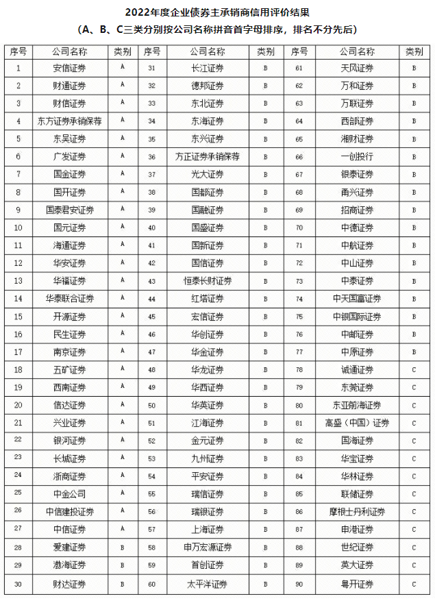 评价结果显示,安信证券、财通证券等27家公司获得A类评价;爱建证券、渤海证券等50家公司获得B类评价;诚通证券、东莞证券等13家公司获得C类评价。2022年企业债券信用评级机构排名前三位为中诚信国际信用评级有限责任公司、联合资信评估股份有限公司和中证鹏元资信评估股份有限公司。