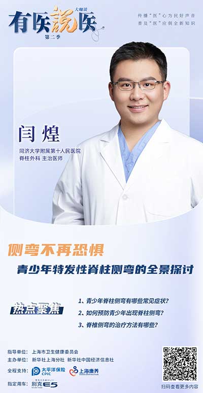 新学期伊始,孩子们面临新的学习任务。近年来,脊柱侧弯已成为继近视、肥胖后,中国儿童的第三大健康问题,严重威胁儿童青少年身心健康。什么是青少年脊柱侧弯?病因有哪些?该如何检测和预防? 本期有医说医大咖谈邀请到同济大学附属上海市第十人民医院脊柱外科主治医师闫煌,他长期从事脊柱畸形的研究和临床工作,并在青少年特发性脊柱侧弯的综合诊疗方面积累了丰富的临床经验。 [详细]